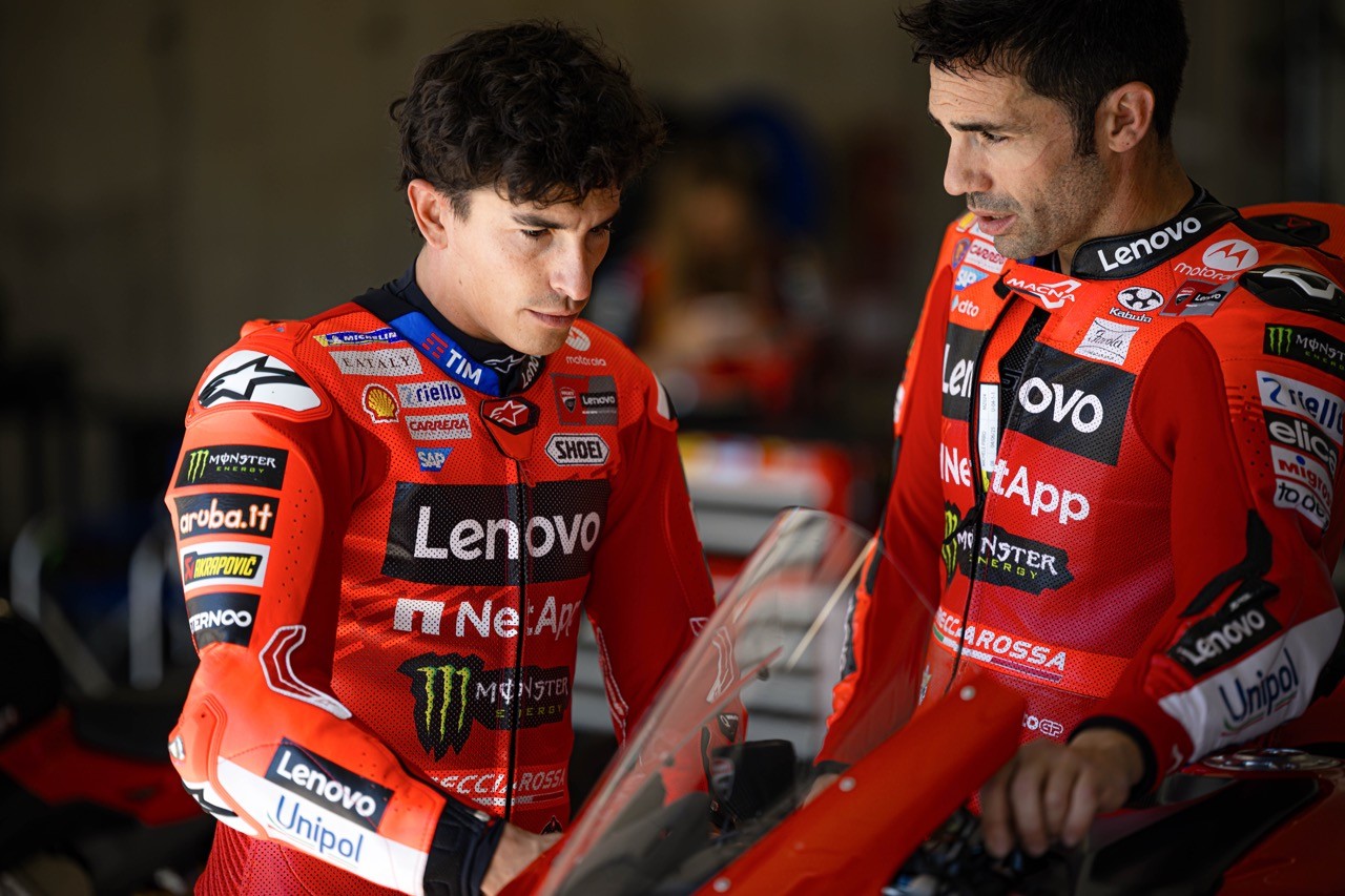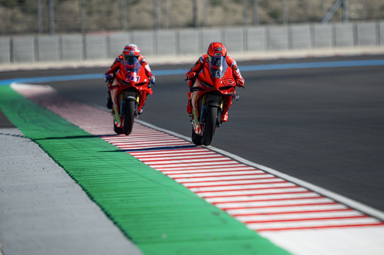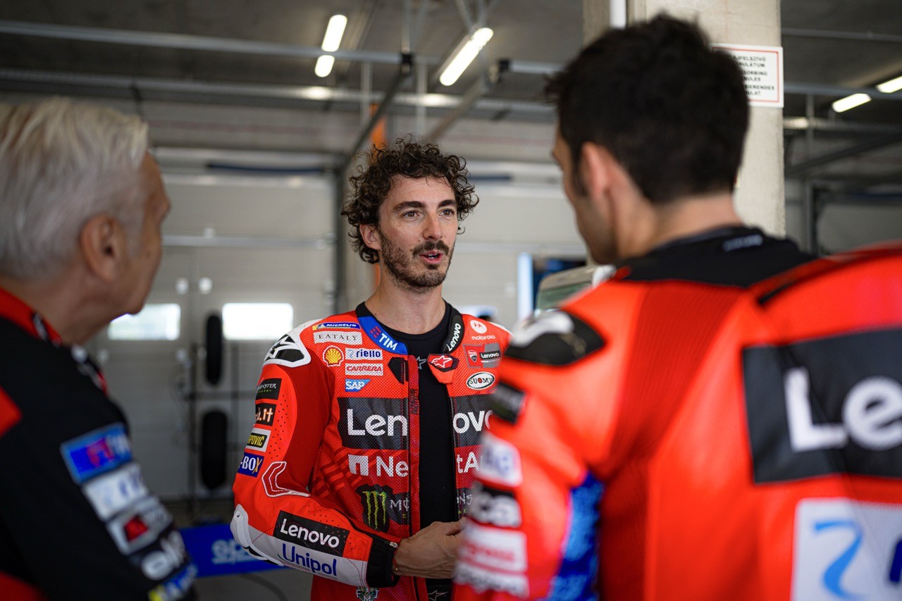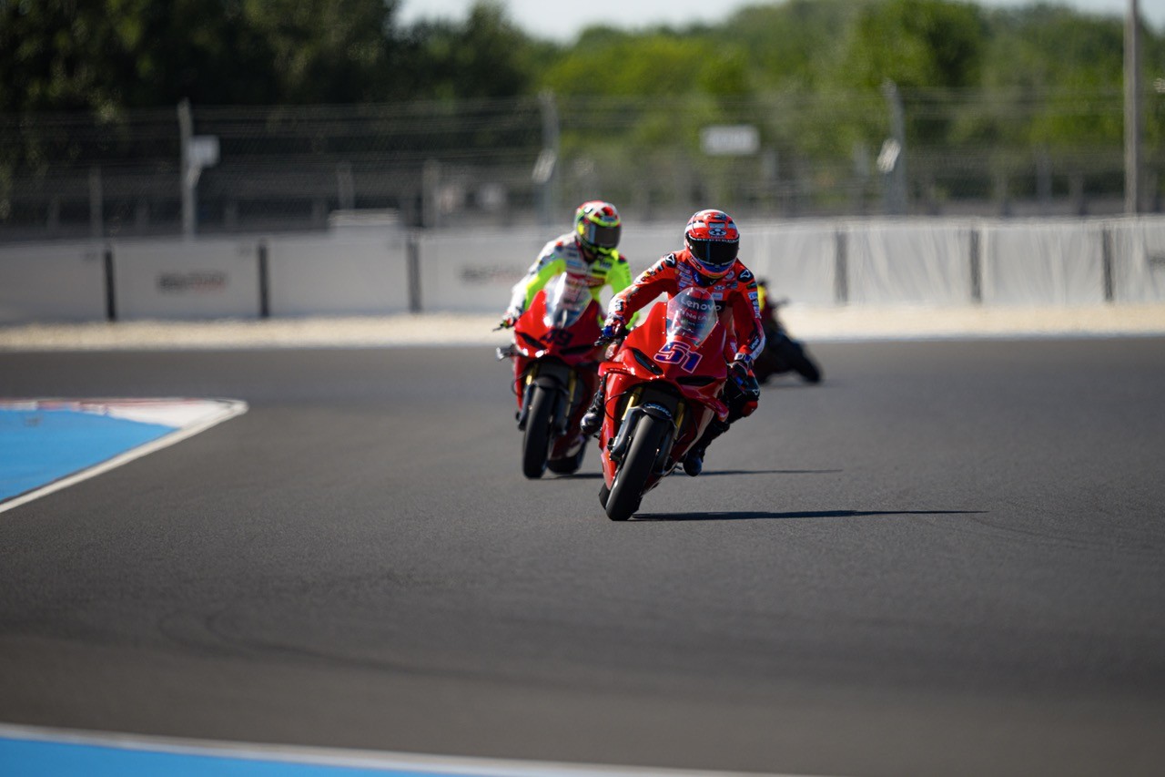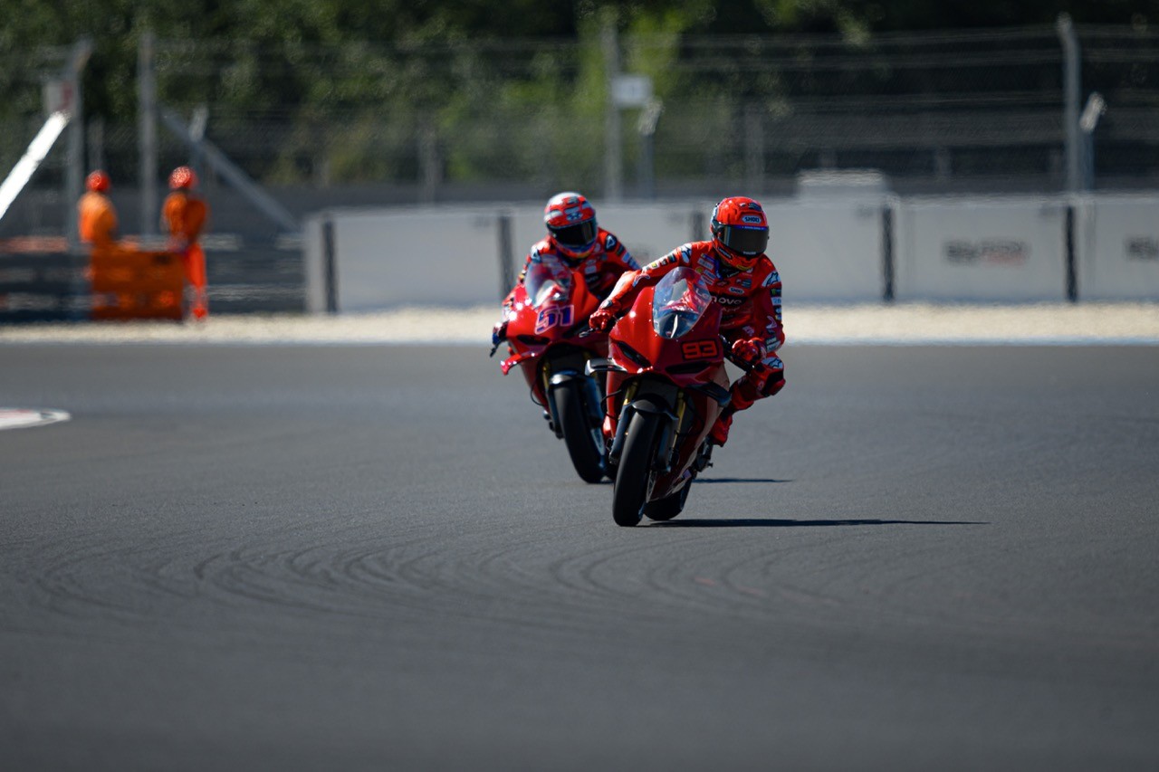 Una sessione che ha visto impegnati Michele Pirro che ha guidato lungo le curve del circuito magiaro i sei rider della factory di Borgo Panigale, tra questi gli ufficiali del team Lenovo, Marc Marquez e Francesco Bagnaia, Alex Marquez e Fermin Aldeguer del team Gresini e i VR46 Fabio Di Giannantonio e Franco Morbidelli.